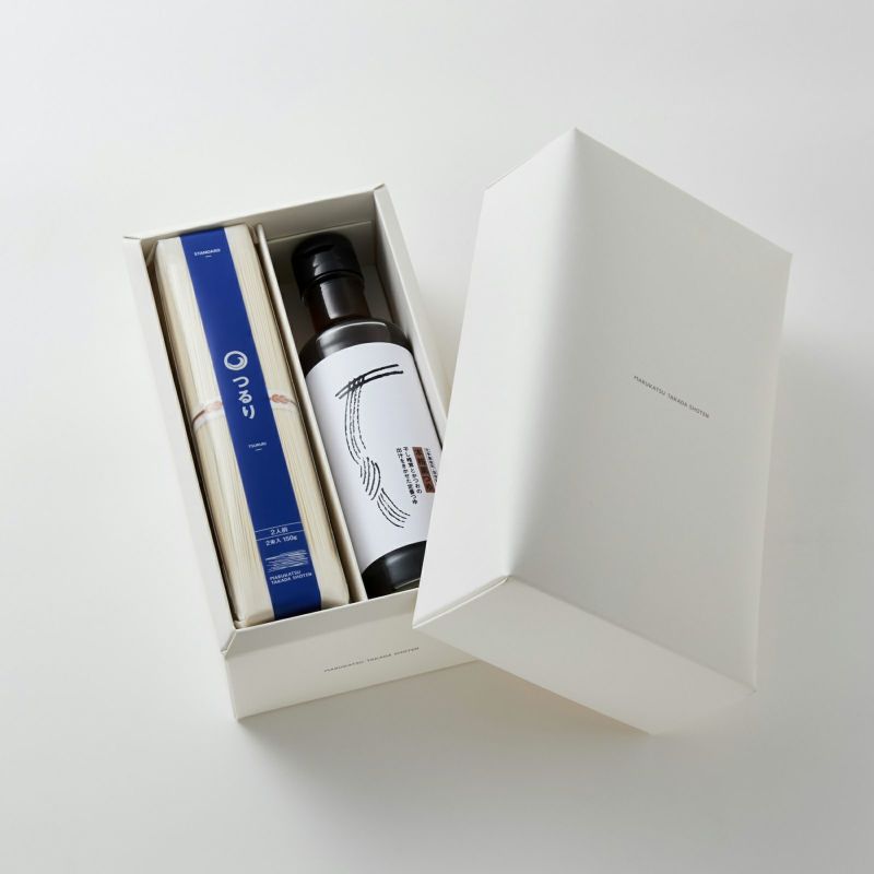 2束入りの袋商品を3袋と、こだわりのつゆを組み合わせたギフトです。 見た目にも華やかで、贈り物にぴったり。 BOXは上品な重みのある紙質で、シックなデザインの帯を巻きます。 洗練された高級感のあるギフトセットです。 ※ギフトボックス商品は包装紙での包装をあえて行っておりません。のし紙は全て「外のし」の形になります。