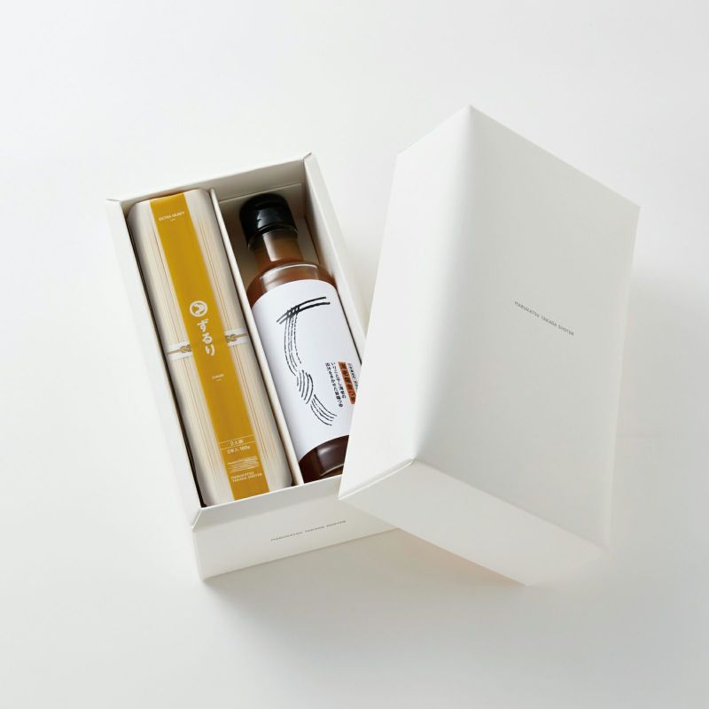 細めに仕上げた平タイプの手延べうどんと、 3?4倍希釈のいりこと干し海老の出汁に梅酢を加えて爽やかな味わいに仕上げた海老塩金つゆを詰合せました。 ※ギフトボックス商品は包装紙での包装をあえて行っておりません。のし紙は全て「外のし」の形になります。