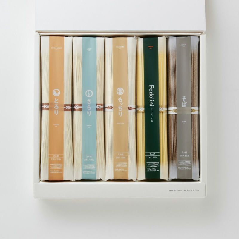 様々な種類の麺を5種類組み合わせました。 こだわりの手延べの麺をお楽しみ頂けます。 マットな質感のBOXにシックなグレーの帯を巻き、高級感のあるギフトセットです。※ギフトBOX商品は包装紙による包装をあえて行っておりません。のし紙は全て「外のし」の形となります。