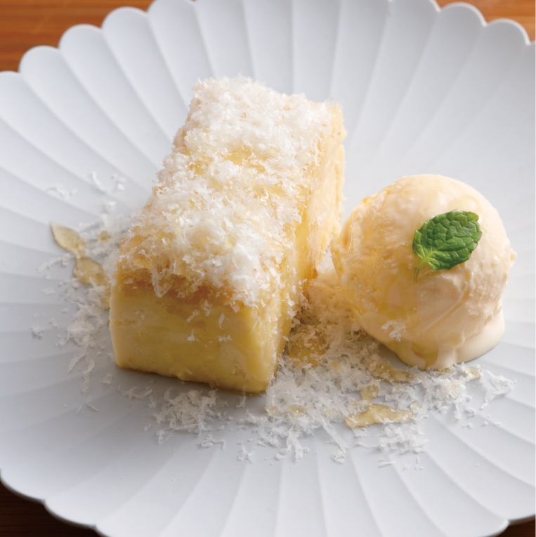 三輪の銘酒「今西酒造」の地酒粕と国産クリームチーズを使用したチーズケーキ。地酒粕の香りやはちみつの甘み、パルミジャーノレジャーノとの塩味のマリアージュをお楽しみ下さい。