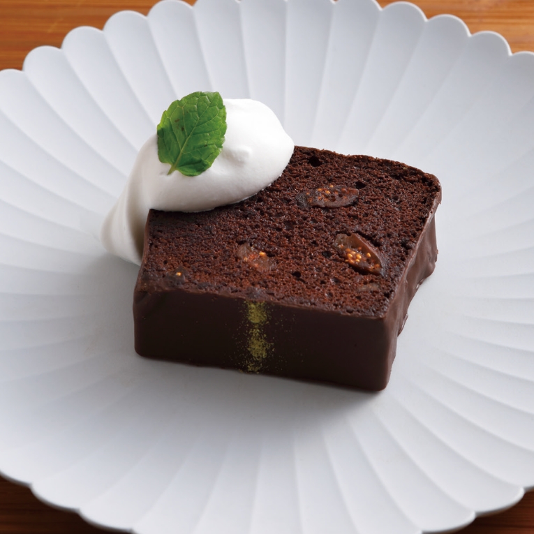 上質なクーベルチュールミルクチョコレートをふんだんに使用した甘さ控えめな生地に、ラム酒やいちじく、奈良県産の山椒を合わせたガトーショコラ。
